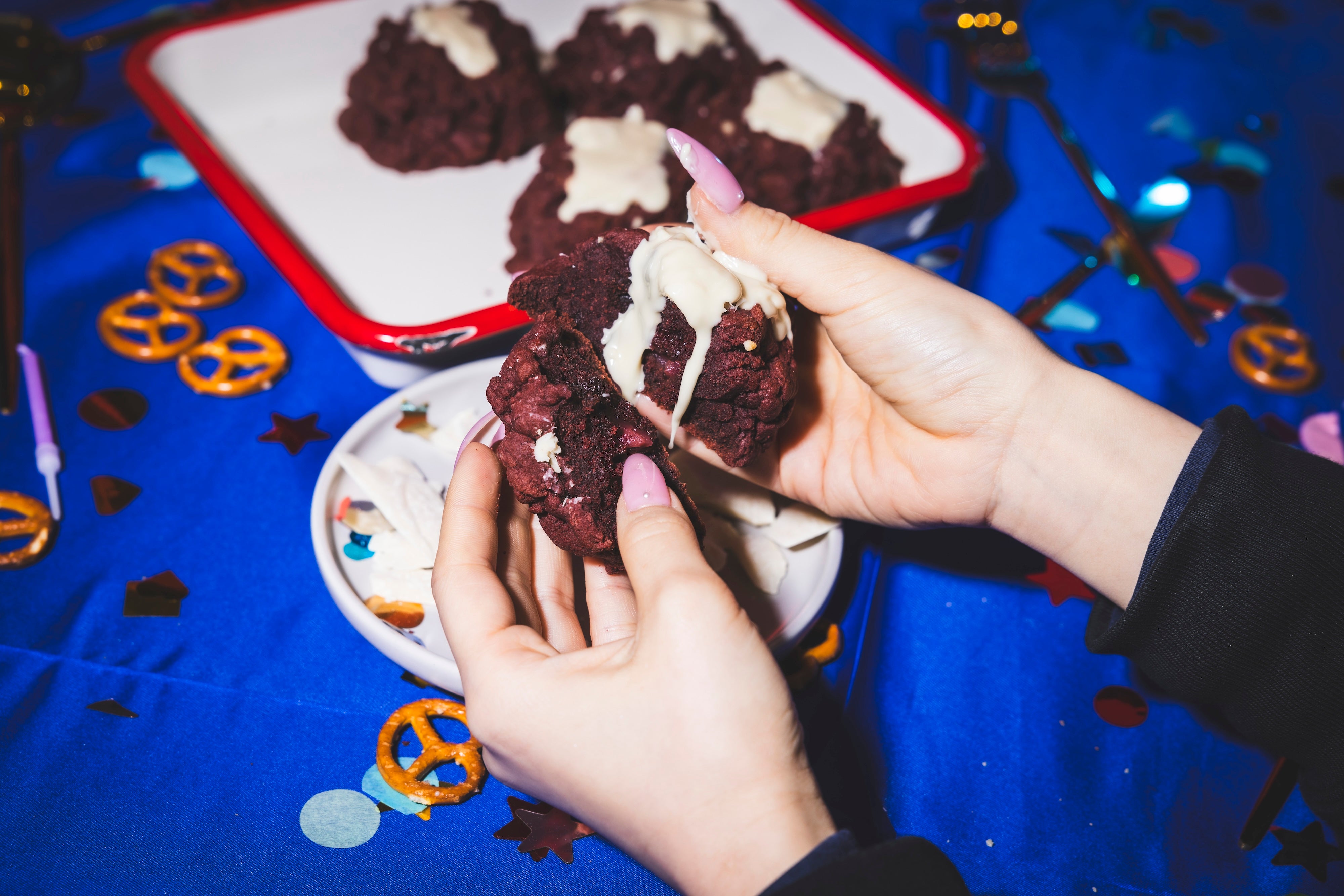 色鮮やかなレッドベルベット生地に、ココア風味と甘さ控えめのチョコチップをたっぷり混ぜ込んだ、ひと口ごとに贅沢な味わいが広がります。❤️