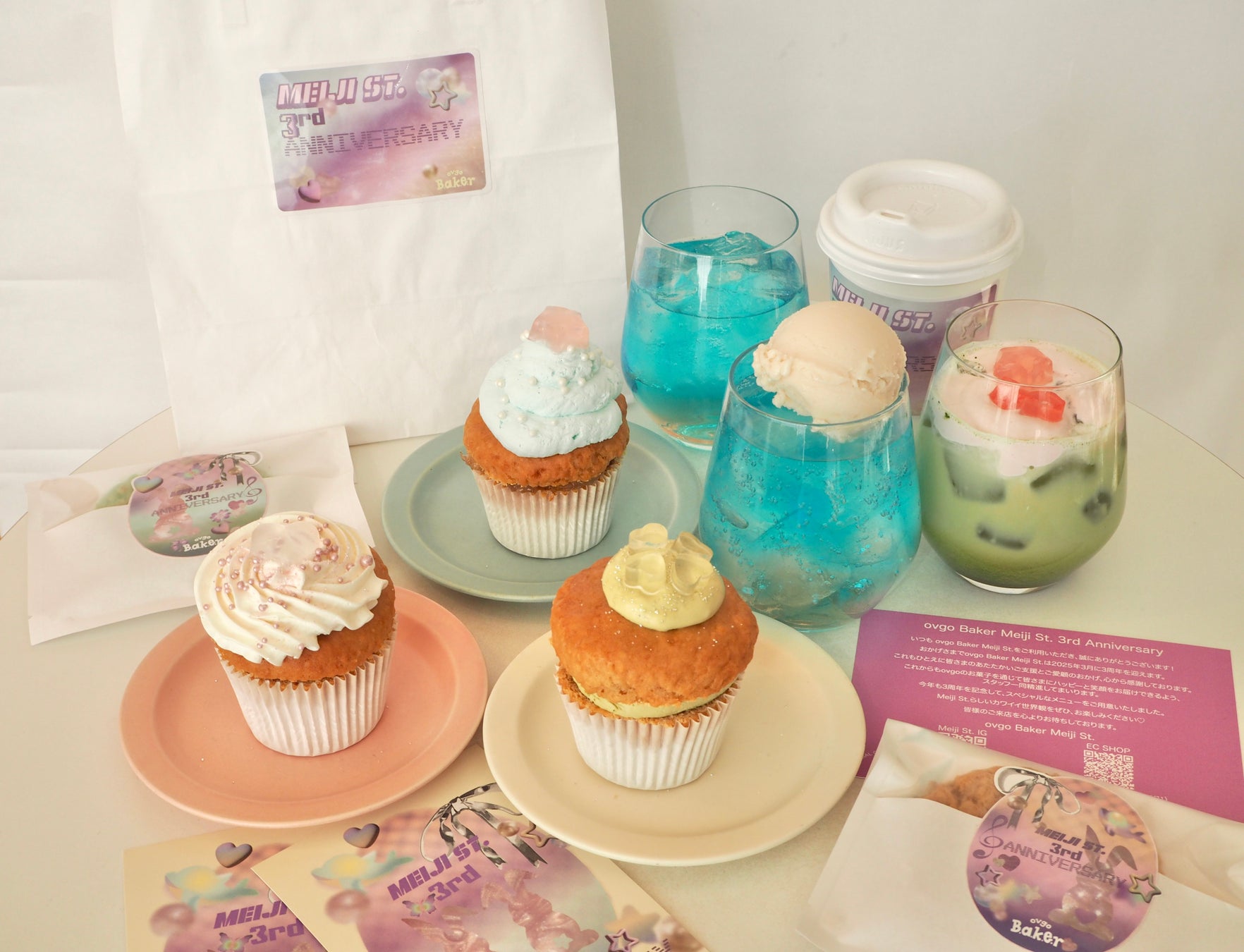 3周年を迎えるovgo Baker Meiji St.(オブゴベイカーメイジストリート)が期間限定のアニバーサリーイベントを開催!華やかな限定カップケーキやクッキー、ここでしか味わえないスペシャルドリンクが登場。店内も思わず写真を撮りたくなるアニバーサリー仕様の特別な雰囲気に♪
