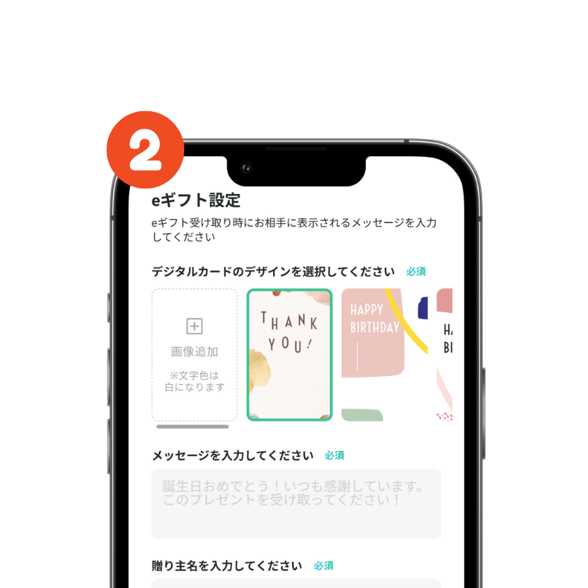 メッセージと送り主名を記入するとギフトカードが作成されます。