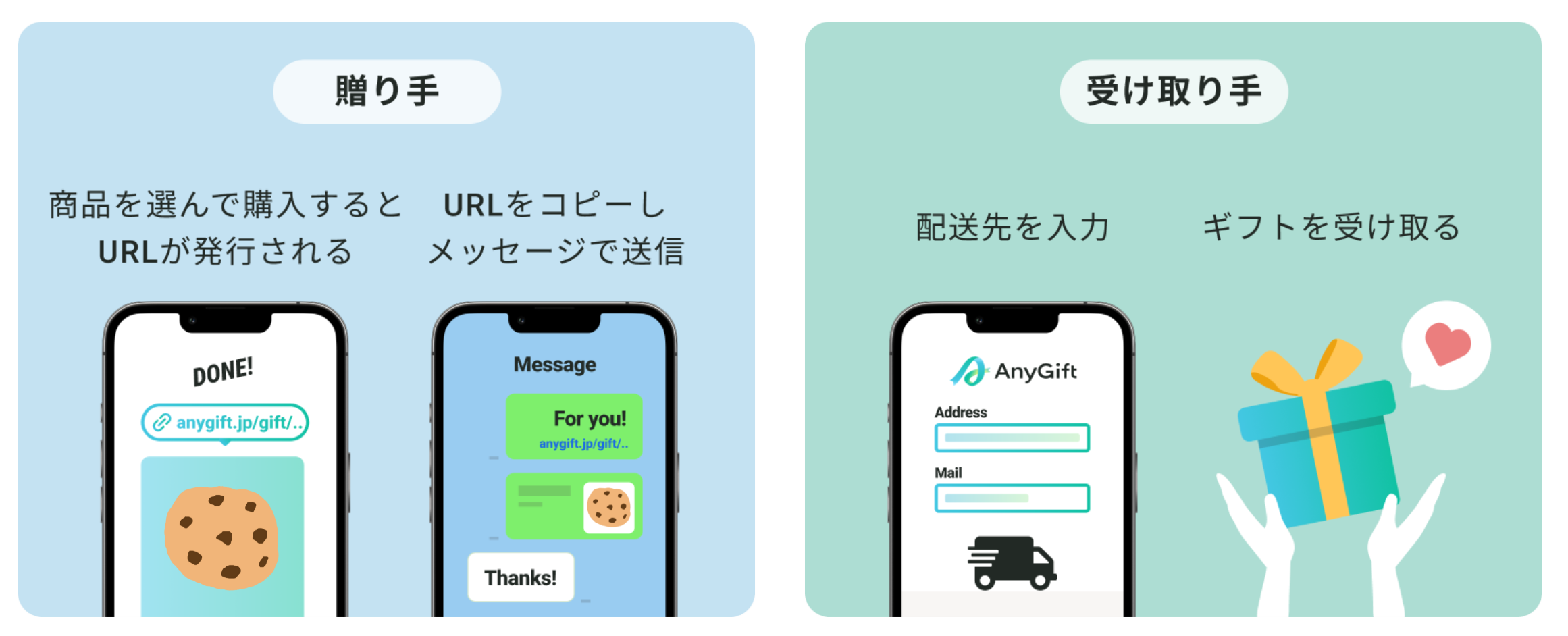 住所を知らなくでも、LINEやメール、SNSなどで受け取りURLを送り、ギフトを贈れるサービスです。